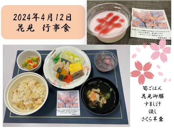 お花見の季節になりました。桜型の豆腐や桜の花びら入りの羊羹、花見御膳にも飾り切りを施し、華やかさを演出しました。旬の鰆もお楽しみいただけます。行事カードは当院で咲き誇った桜のお写真です(室長撮影)。お花見気分を味わいながら、お召し上がりいただきました。