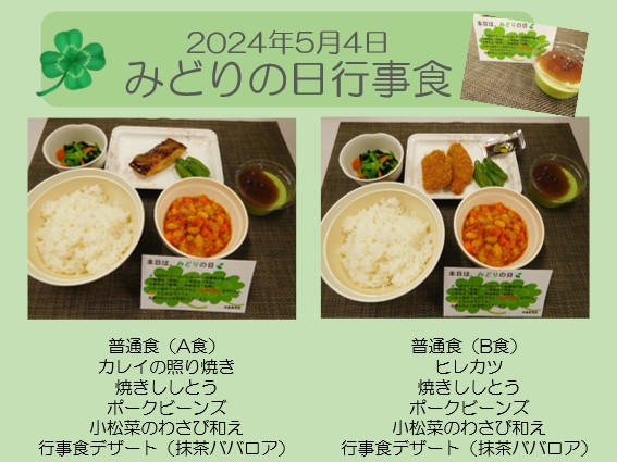 桜も散り、新緑に包まれる暖かい季節となりました。みどりの日は、「自然に親しむとともにその恩恵に感謝し、豊かな心を育む」日です。「カレイの照り焼き」か「ヒレカツ」をお選びいただけます。獅子唐や小松菜、抹茶ババロアと緑を感じられる献立となっています。