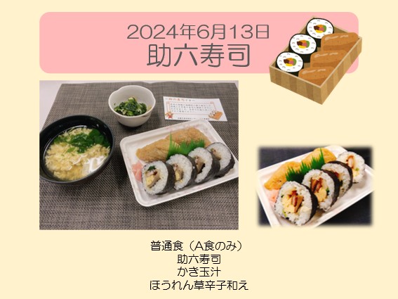梅雨の季節となりました。少しでも気分が晴れるよう手作りのお寿司はいかがでしょうか。稲荷は揚げから手作りです。患者さんからも大人気のメニューです。