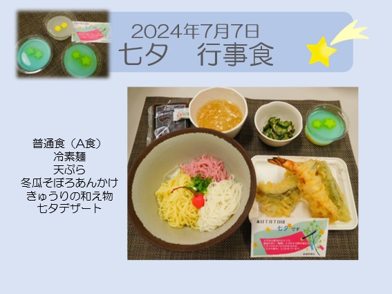 暑さを感じる頃となりました。今日は七夕。彩り豊かな七夕そうめん、デザートで涼しさを感じる献立です。デザートには、輝く星を散りばめました。織姫と彦星の再会を願いましょう☆皆様、何をお願いしましたか?
