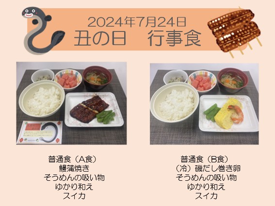 暑い日が続いていますね。すいかやそうめんなどで初夏を感じるさっぱりとした献立となりました。「丑の日」には「う」のつく食べ物を食べると夏負けしないという昔ながらの風習があります。今年も鰻を食べて夏バテを吹き飛ばしましょう!