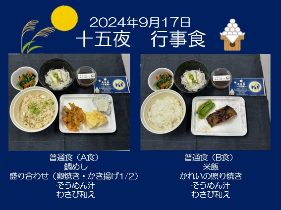 日も短くなってまいりました。今日は十五夜。「盛り合わせ」か「かれいの照り焼き」をお選びいただけます。そうめん汁のめんつゆは手作りで愛情たっぷり!忙しい毎日ですが、今日は窓からきらきら輝く満月を見上げてみませんか?