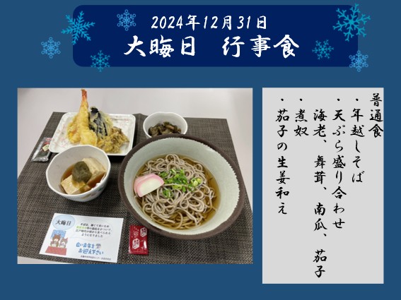 本日は大晦日を迎え、1年の感謝を込めて年越しそばと天ぷらをご用意しました。