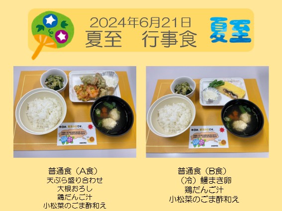 1年間で最も昼間の時間が長い夏至の日となりました。「天ぷら盛り合わせ」か「鰻まき卵」を選択可能で、生姜の効いた鶏団子汁も加わり、スタミナたっぷりの献立となりました。